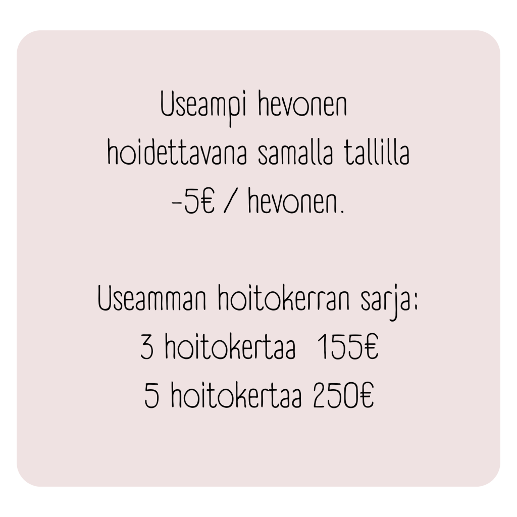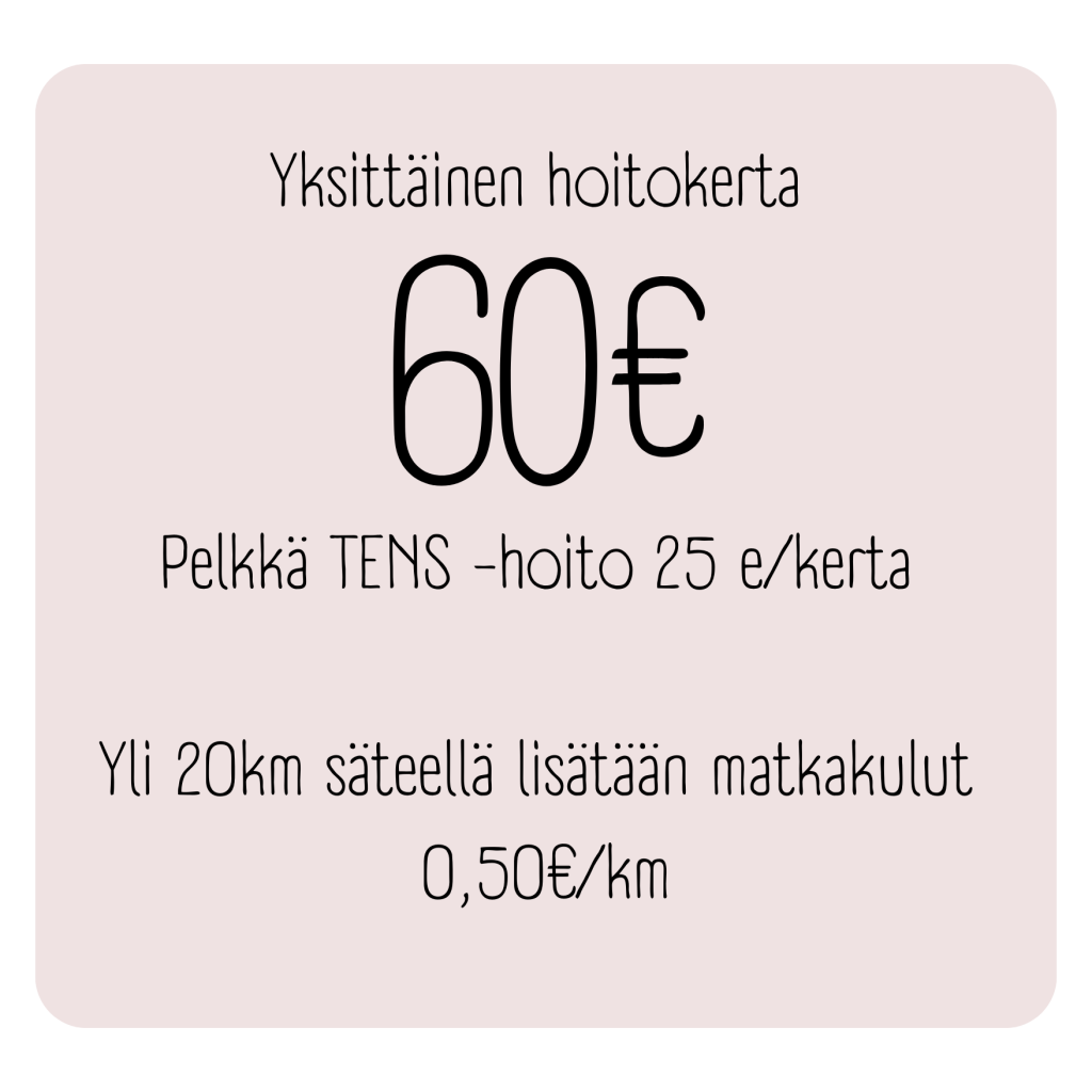 - HUOM! Peruthan varatun ajan vähintään 24h ennen sovittua hoitoaikaa. Alle 24h ennen hoitoa peruutetuista ajanvarauksista veloitetaan puolet hoitomaksusta. Kokonaan perumatta jääneistä ajanvarauksista veloitetaan hoitomaksu kokonaisuudessaan, mikäli tulen turhaan paikanpäälle.